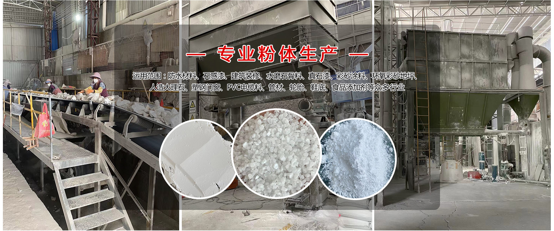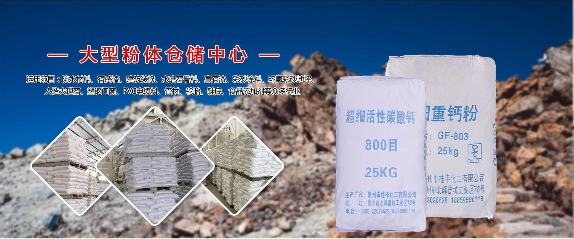 泉州市桂豐化工有限公司是一家有十幾年粉體技術研究和生產經驗的企業,公司集粉體技術開發、礦山開采、粉體生產為一體。主營:滑石粉、重質碳酸鈣粉、活性碳酸鈣、方解石粉、大理石砂等產品。專業生產十大系列10目-8000目石粉產品。得益于優良的礦山礦石資源,我司生產的產品具有白度高,純度高,粉碎充分,粒度分布均勻,化學成份穩定等特點。產品廣泛運用于醫藥、化妝品、食品、鞋材、家裝、造紙、橡膠、塑料、涂料、油漆、油墨、陶瓷、電線、電纜等眾多行業。 經過十多年快速的發展,我司擁有了三個礦石粉生產基地,三十多臺套的生產設備,員工規模達到一百五十多人。多年來,公司堅持以市場為導向,不斷加大科技投入,與國內大學院校,專業粉體研究機構保持常年合作,實行產學研銷一體發展。針對不同行業不同產品客戶的差異化需求,制定一對一的技術支持與生產跟進服務,把“提高客戶產品品質,降低生產成本,實現客戶效益提升”作為公司的服務宗旨。目前,公司產品在國內大部分省份均有銷售,并出口到了國外市場。
